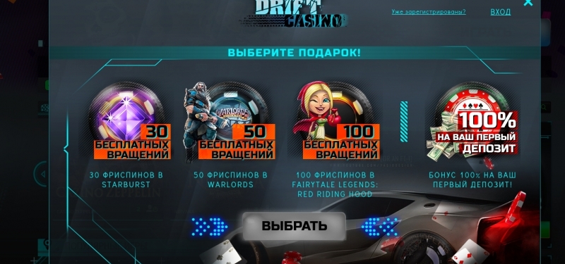 🎁 Как и во всех популярных интернет заведениях, в Дрифт Казино начисляется приятный бонус за регистрацию. Взамен предлагаются дополнительные фри спины и до двадцати бесплатных дрифтов. Игроки могут использовать начисленные бонусы лишь в игровых автоматах, на которые распространяются условия проведенной акции.