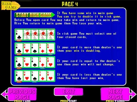 Результатом удачного спина считается денежная выплата. После получения приза перед игроком стоит нелегкая задача – забрать выигрыш или постараться увеличить его в 2 раза. Рискованная игра протекает за известными опытным игрокам правилами. На экране появляются 5 игральных карт. Первая карта слева принадлежит дилеру. Она открыта. Оставшиеся 4 карты, расположенные рядом, повернуты рубашкой к верху. Игроку необходимо, используя интуицию и внутреннее чутье, выбрать одну из них, и надеяться, что номинал выбранной карты окажется выше, чем карта торговца. Удачно сделанный выбор увеличивает выигрыш вдвое. В случае проигрыша пользователь лишается денежной выплаты в размере последнего спина. Отказаться от рискованной игры можно в любой момент.
